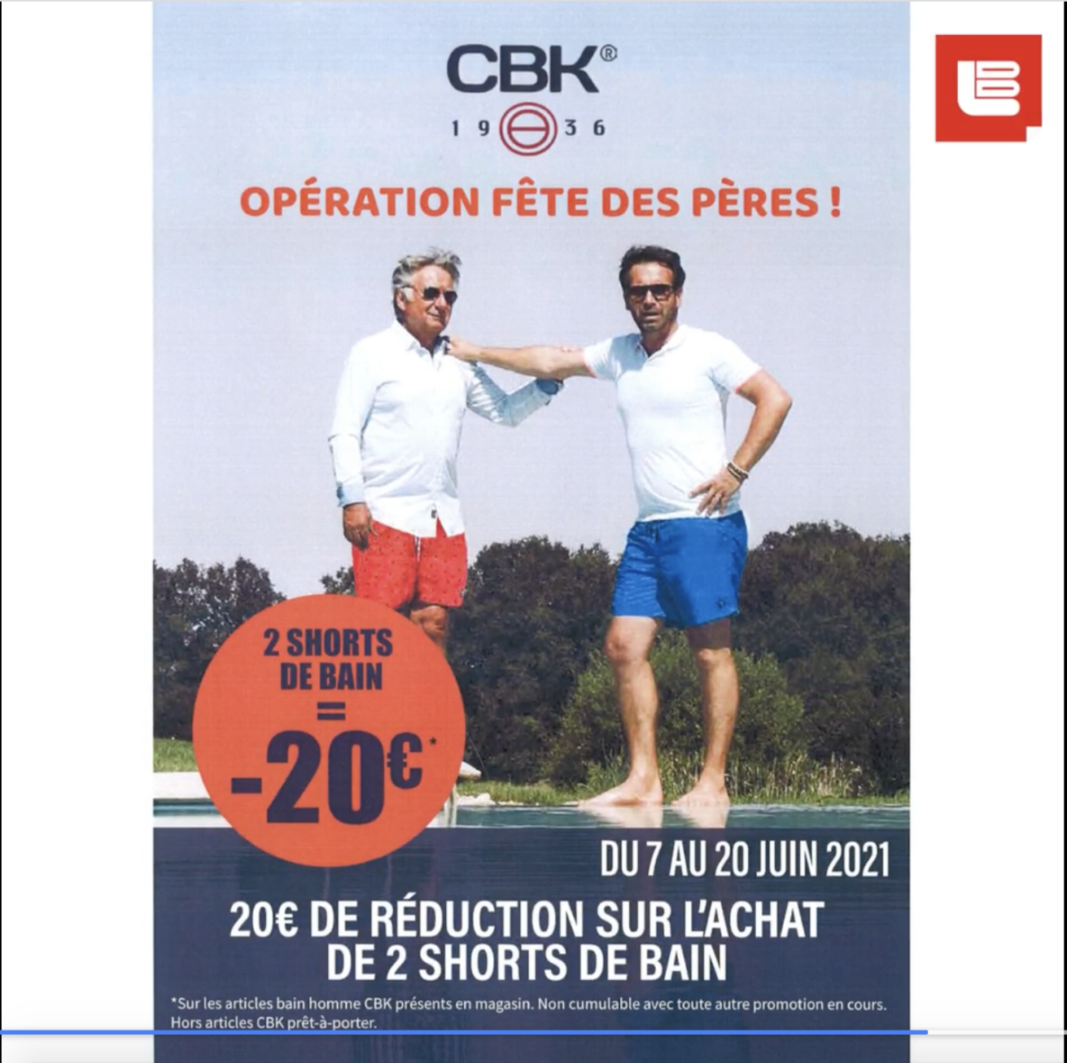 2 offres spéciales fête des pères sur la marque « CBK » ! La Fête des Pères approche à grands pas ! A cette occasion, LEVY BLUM vous propose 2 offres spéciales « CBK » jusqu’au 20 juin -30% sur toute la collection -20€ pour l’achat de 2 shorts de bains Profitez-en pour gâter votre super Papa