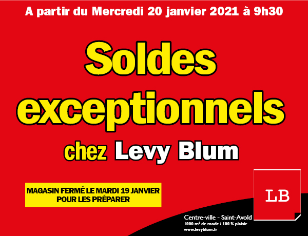 Les soldes démarrent fort chez LEVY BLUM à partir du mercredi 20 janvier ! Des remises exceptionnelles à découvrir en magasin. Afin de préparer au mieux ce démarrage, le magasin est exceptionnellement fermé le mardi 19 janvier toute la journée.